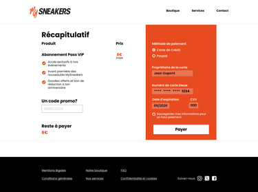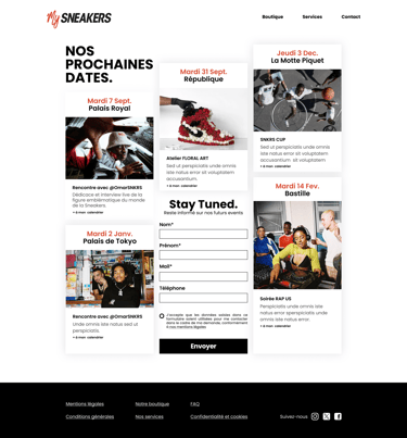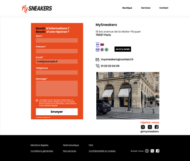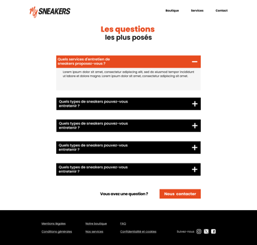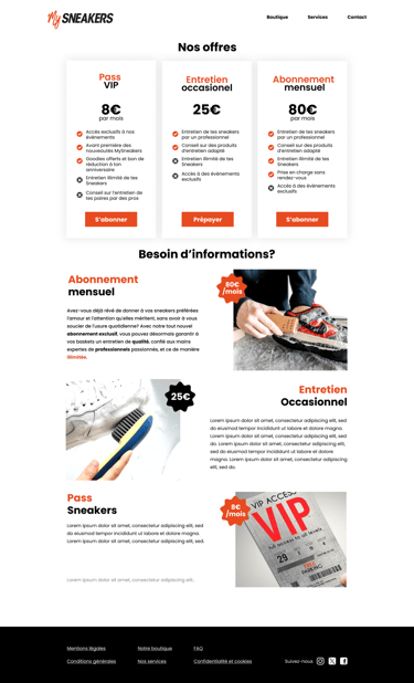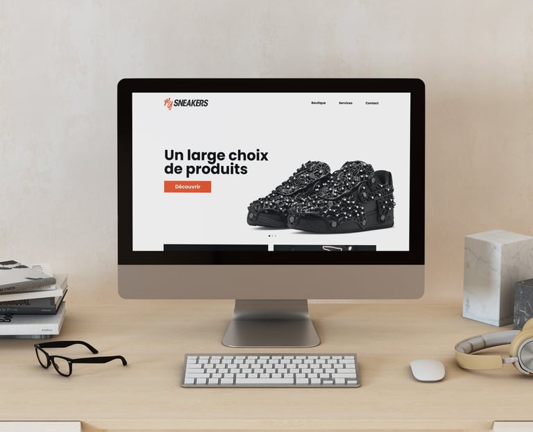 Création d’une maquette UX et UI pour le site e-commerce de My Sneakers, une boutique spécialisée dans l’entretien et la rénovation de sneakers. Réalisé sur Figma, le projet propose une interface claire et accessible, pensée pour valoriser les services de nettoyage, de customisation et les produits associés, tout en facilitant le parcours utilisateur jusqu’à la prise de commande.
